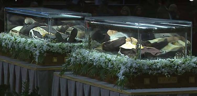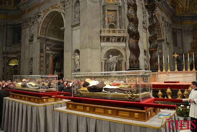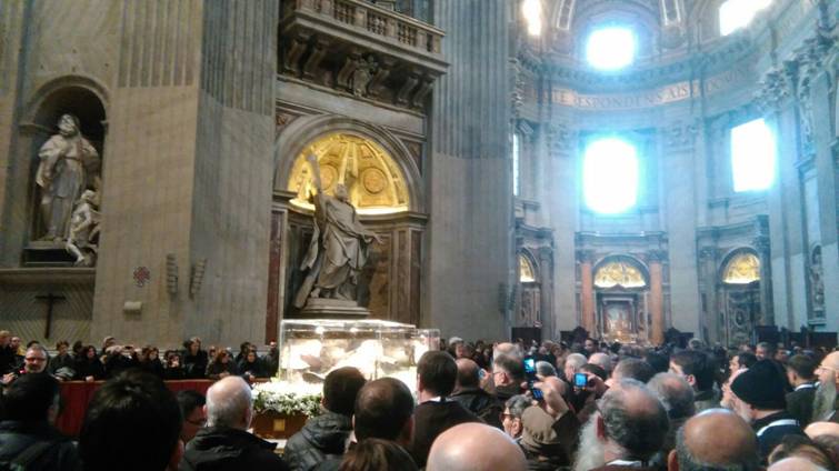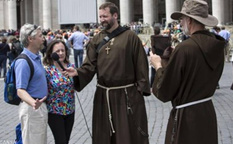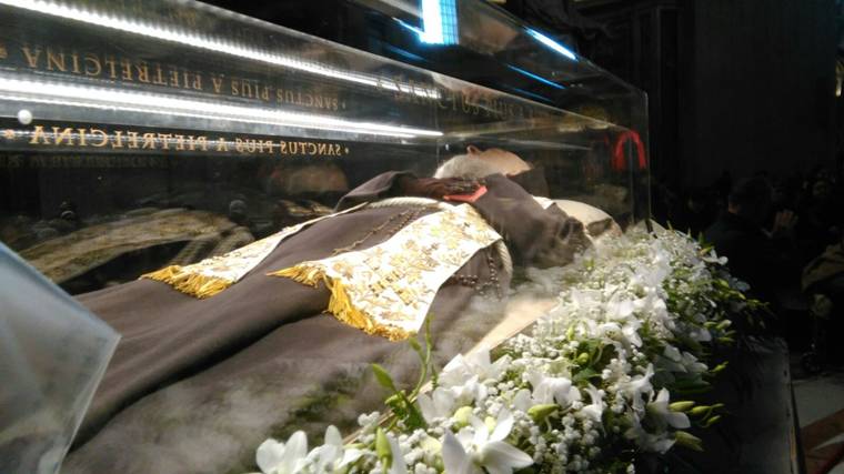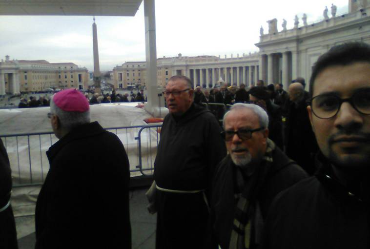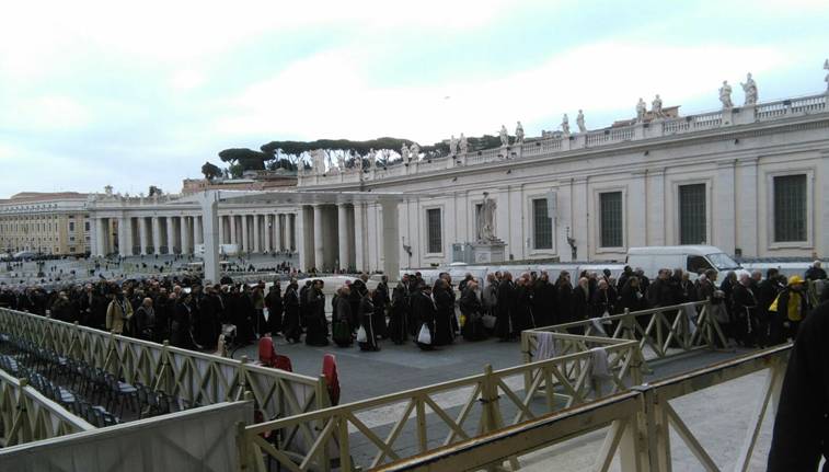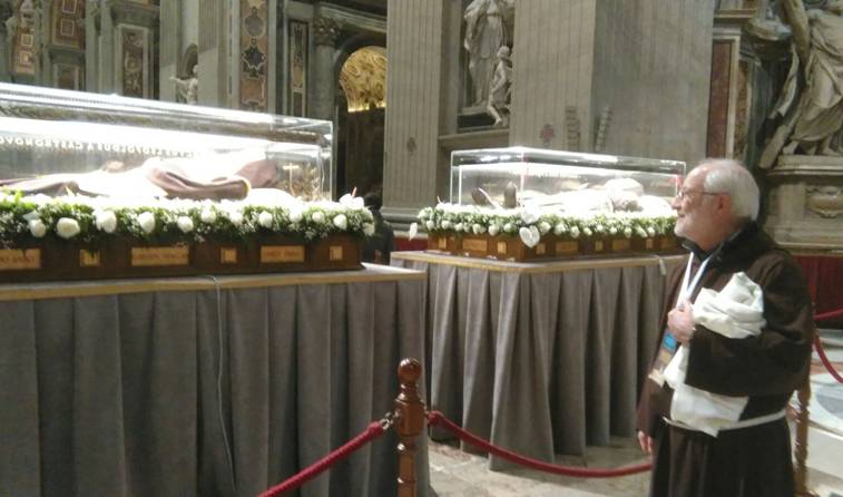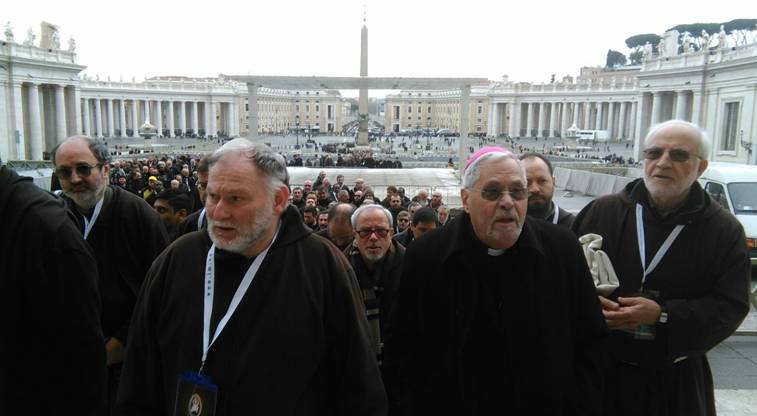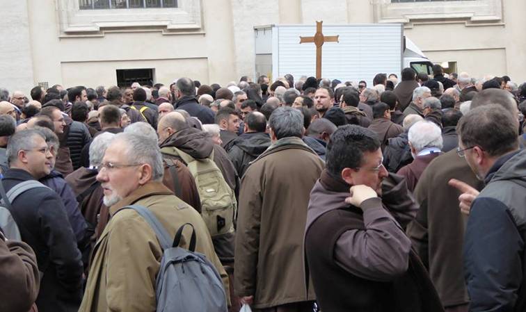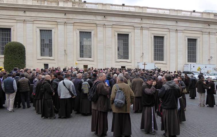 Barbe lunghe e sai marroni; mani giunte e teste rivolte verso il basso in attesa dell’inizio della Messa; un clima generale di preghiera, dato dalla presenza delle urne contenenti i corpi dei due santi confessori Pio e Leopoldo, davanti alle quali andavano accalcandosi sempre più fedeli.